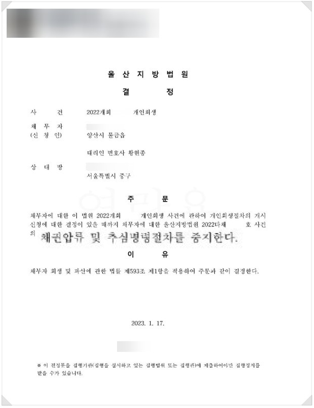 셋째, 압류나 강제집행이 중지됩니다. 급여 압류, 예금 압류, 부동산 경매 등의 강제집행 절차가 모두 중단되어 안정적인 생활을 유지할 수 있게 됩니다.